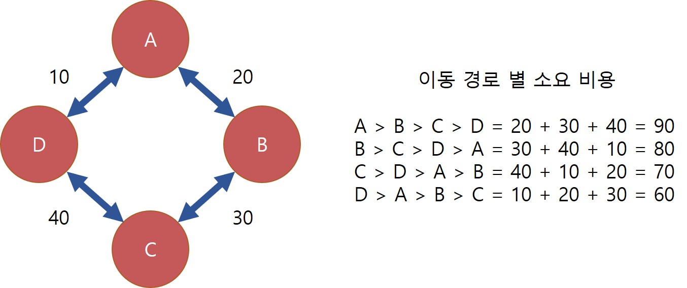 - 위의 표를 보면 가장 비싼 구간인 D - C 구간을 피한 4번째 경로가 가장 작은 비용이 든다