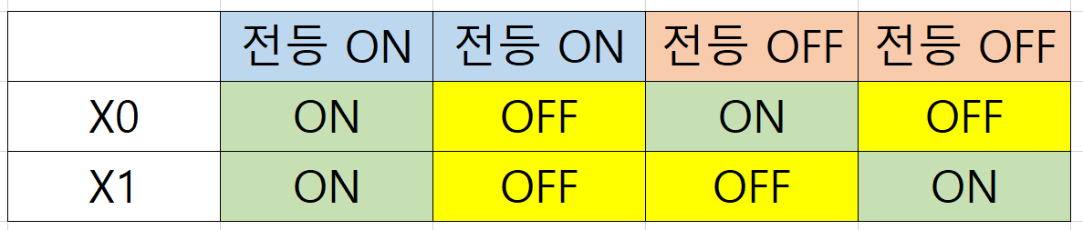 - 위의 4가지 경우의 수에서 X0, X1이 둘다 ON이거나 둘다 OFF인 경우에 전등이 ON 되면 된다.