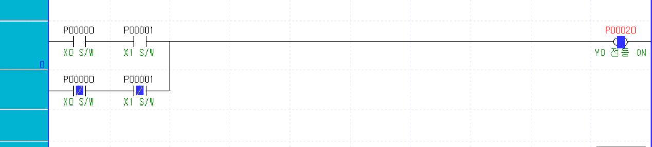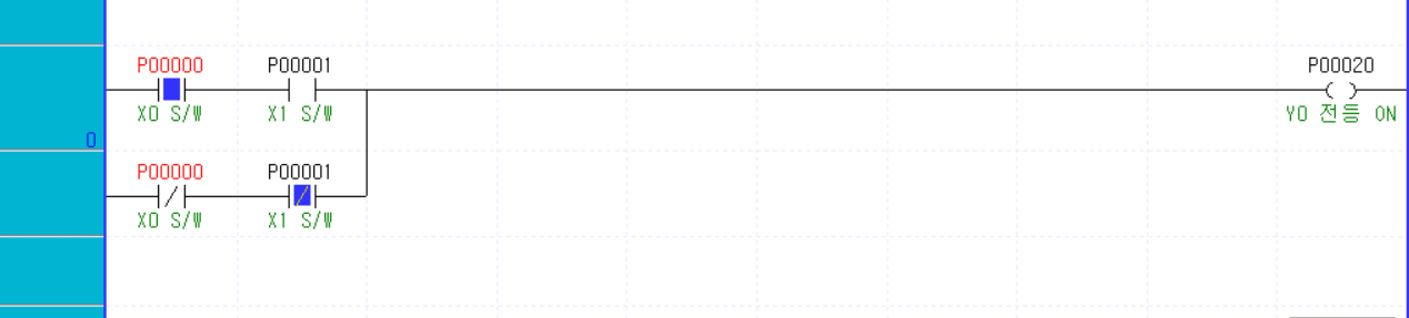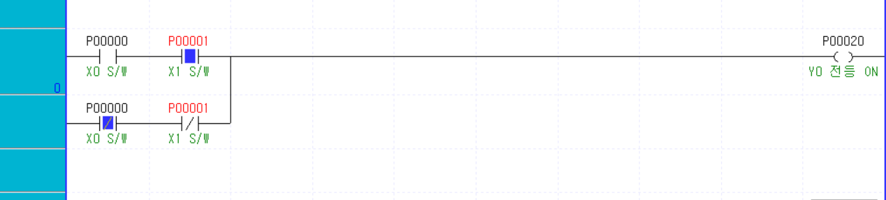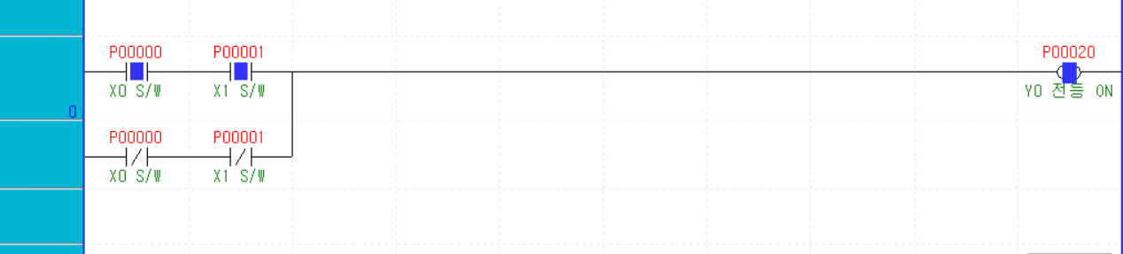 - Y0이라는 전등을 X0 스위치와 X1 스위치를 이용해 ON/OFF 하기