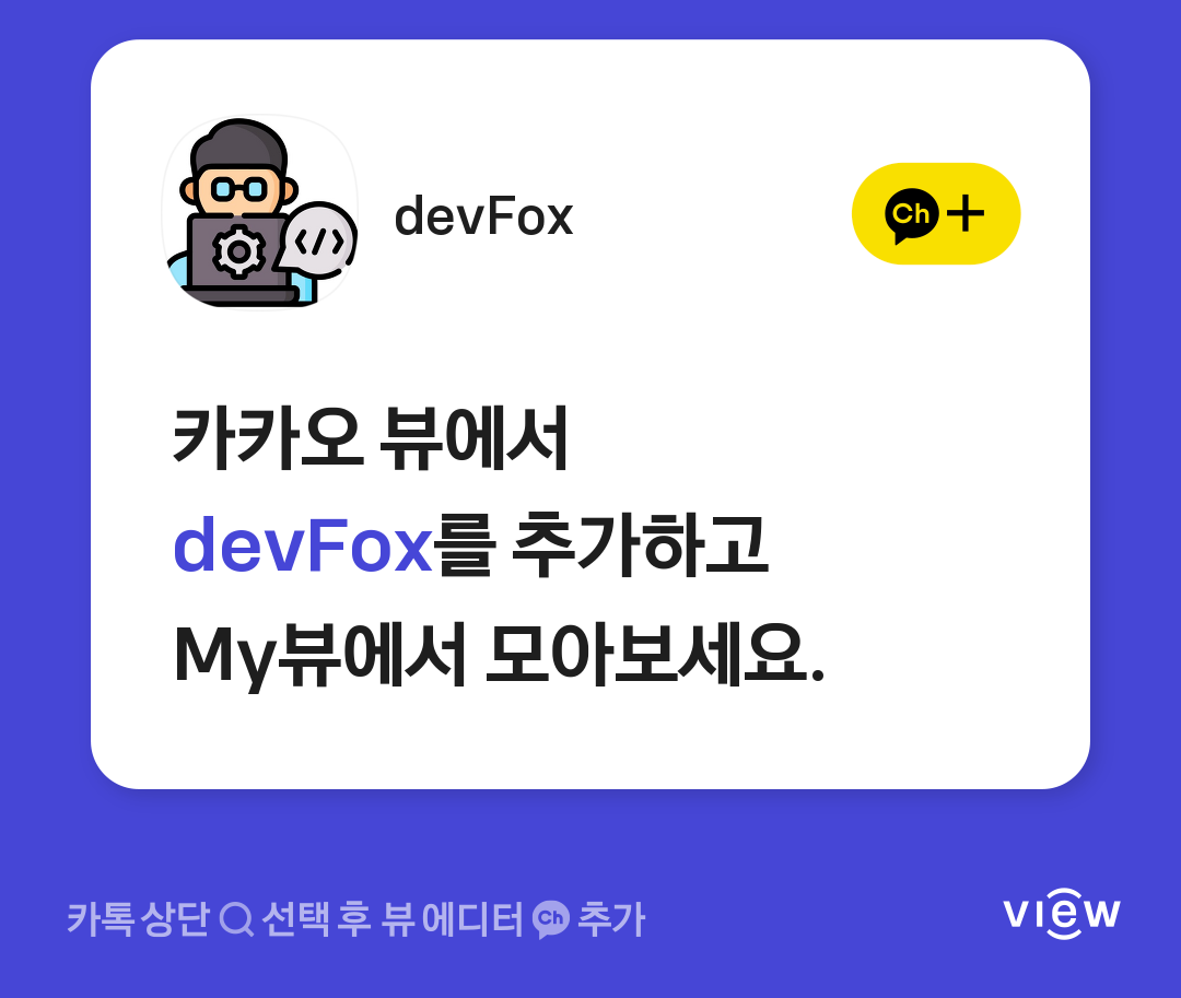카카오 뷰에서 devFox를 추가하고 My뷰에서 모아보세요. 카톡 세 번째 뷰탭 - 카카오 뷰 바로가기 http://pf.kakao.com/_CWxgTxj