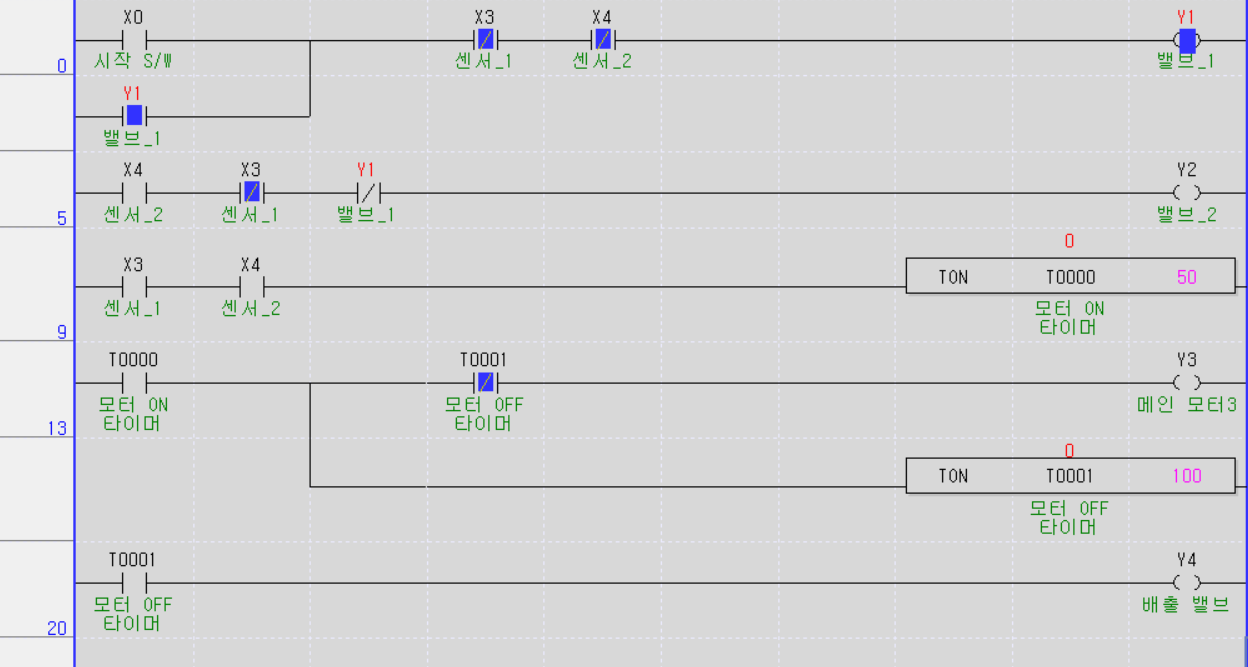 - 시작 스위치가 눌리면 센서1(X3), 센서2(X4)가 OFF된것을 확인하고 밸브1(Y1)을 ON