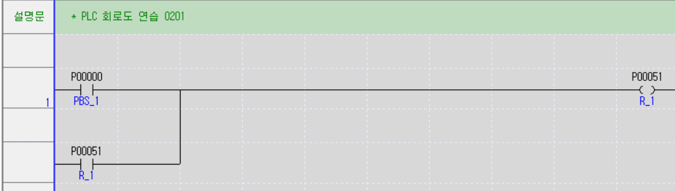 - 푸시버튼스위치 PBS_1가 순간적으로 ON된것을 감지하여 R_1을 계속 ON 상태로 유지하는 회로이다.