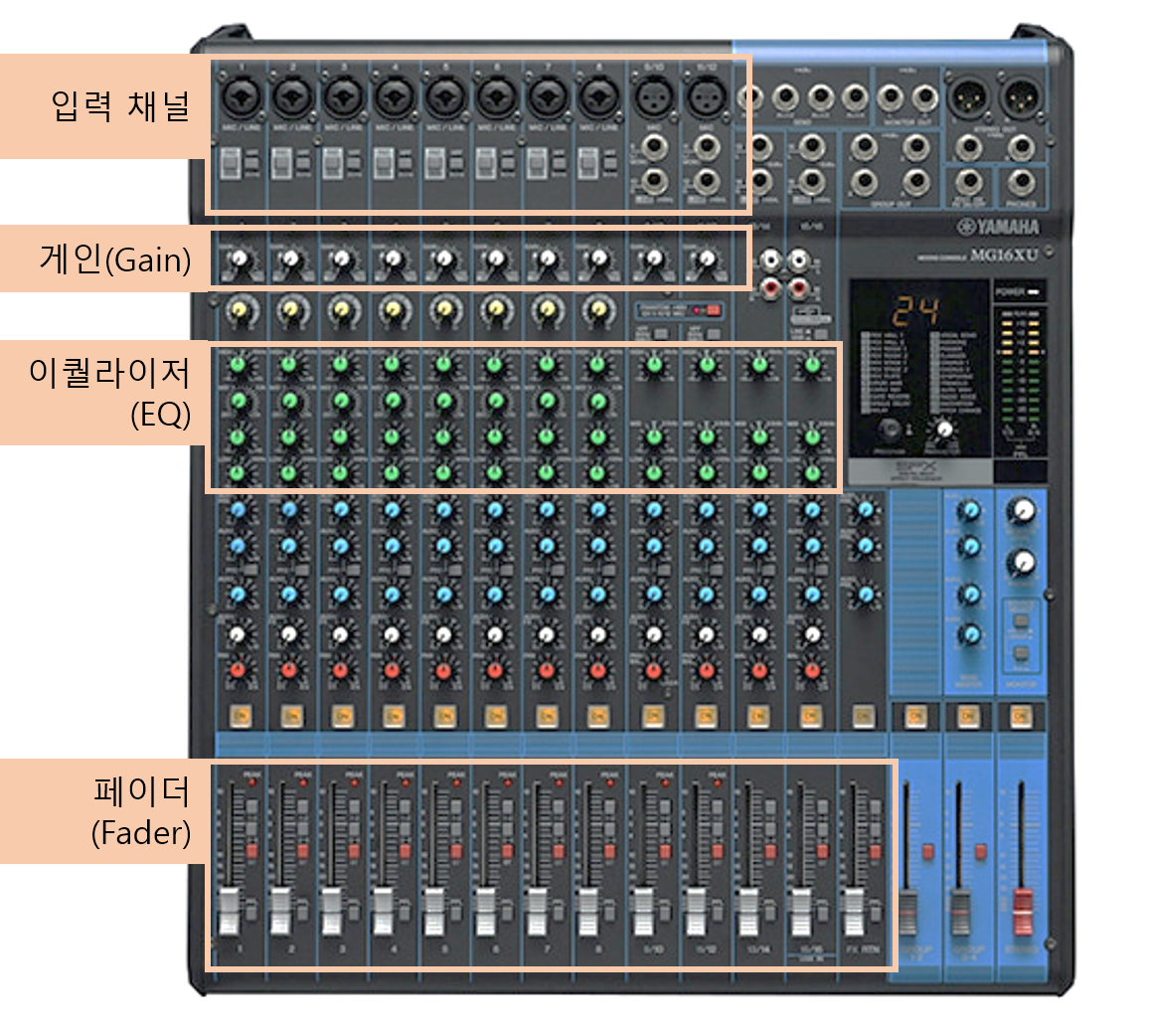 이 입력 채널에서는 소리의 크기(Gain, Fader), 음색(EQ), 효과(Effect) 등을 조정할 수 있습니다.