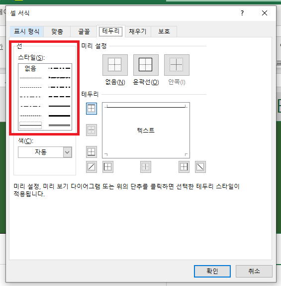 * 위의 LineStyle과 Weight는 엑셀 셀 서식에서 보이는 속성값을 설정한다.(아래 그림 빨간 사각형 참조)