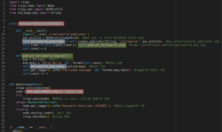 - self.helloworld_publisher : helloworld_publisher라는 이름으로 노드 이름 지정